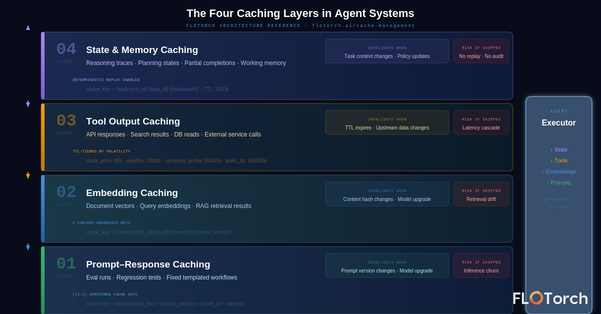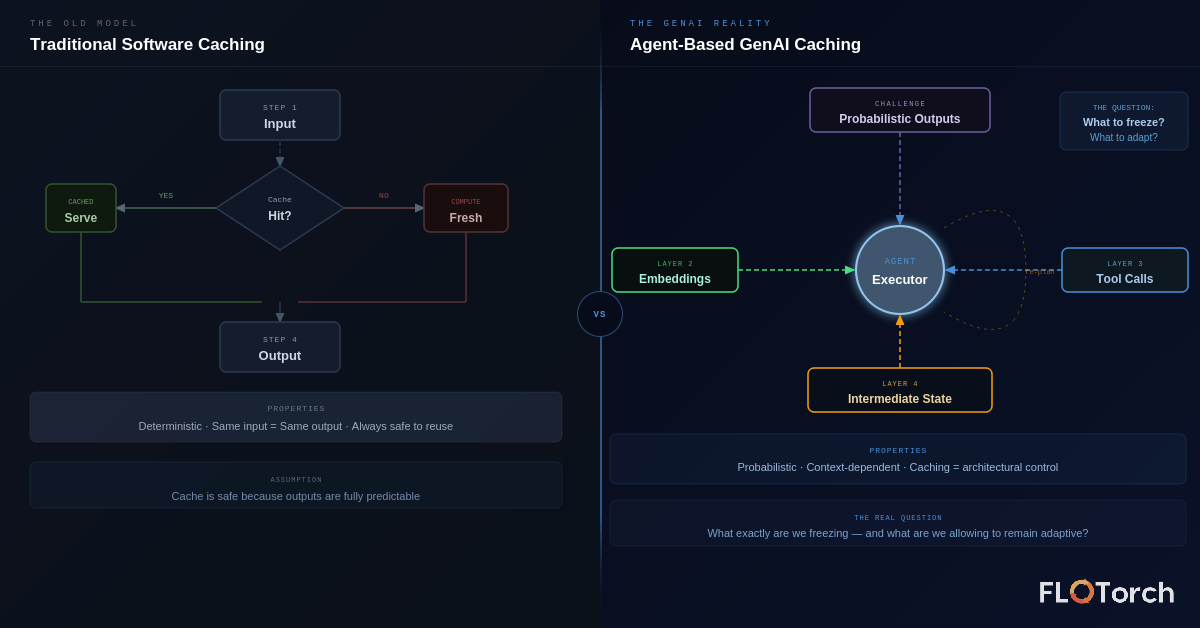 Once you see it this way, caching stops being an optimization. It becomes a control mechanism: the architectural decision about which parts of your agent's intelligence are stable enough to reuse, and which must be recomputed fresh. FloTorch's agent-aware cache management is built on exactly this principle — caching as a behavioral guarantee, not a performance trick.